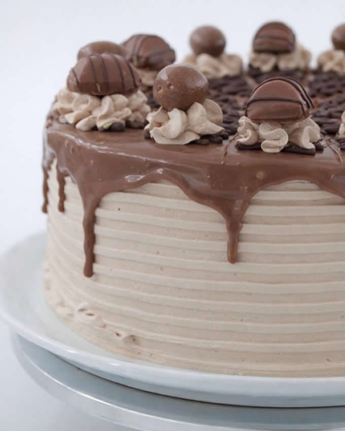 laterales, y decorada con trufas y bombones sobre rosetones de crema.