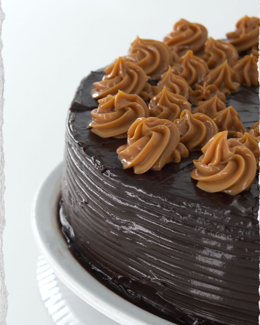 Bizcocho húmedo de chocolate con capas de dulce de leche y cubierto con ganache de chocolate negro.